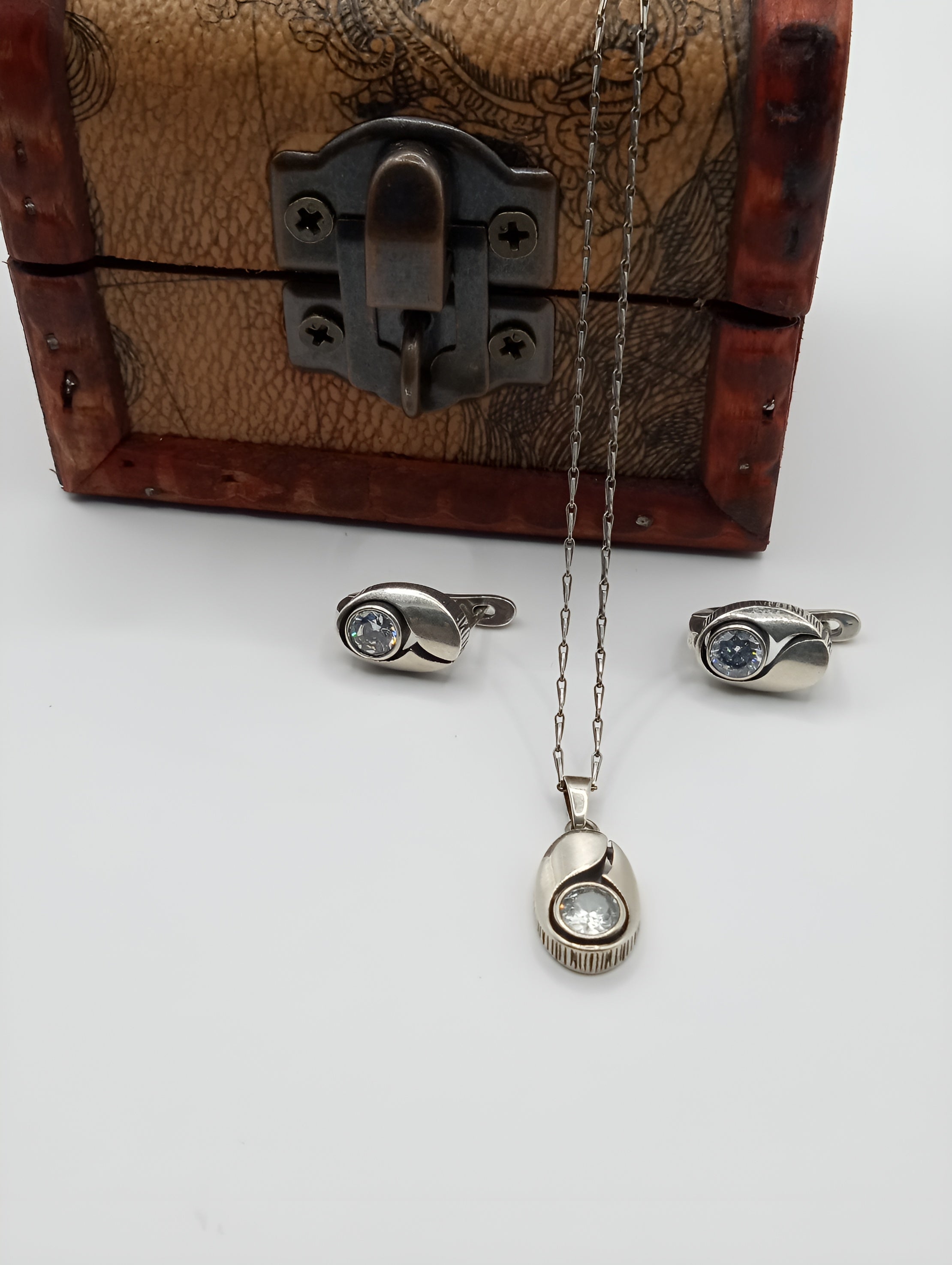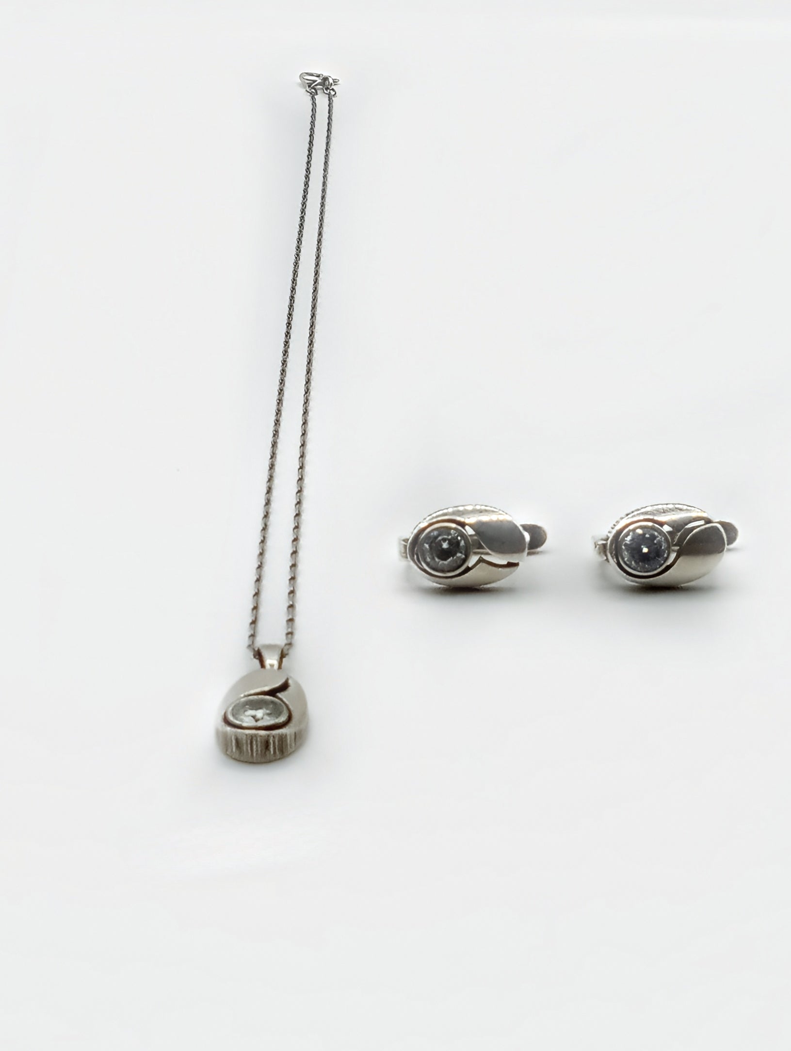This jewelry set is a stunning piece of work that was designed by Karl Laine in the 1960s. The set includes a pendant and earrings, both made of silver sterling. The metallic surfaces used in the design add a unique and eye-catching element to the jewelry, while the contrast between matte and gloss surfaces creates a dynamic and interesting look.